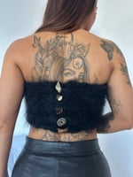 Freehand corset style buttoned tube top made with biodegradable mohair yarn in black, then brushed with a carder to create a beautiful fur look.